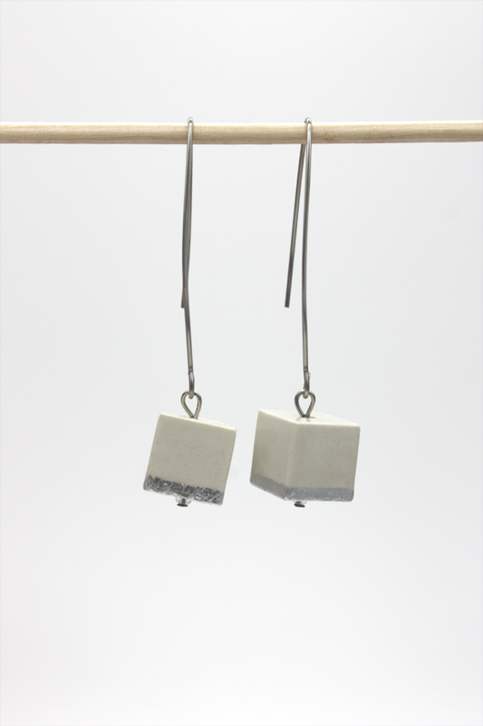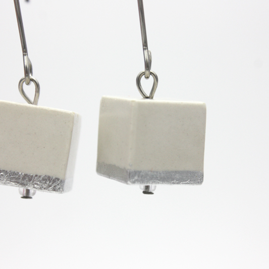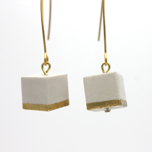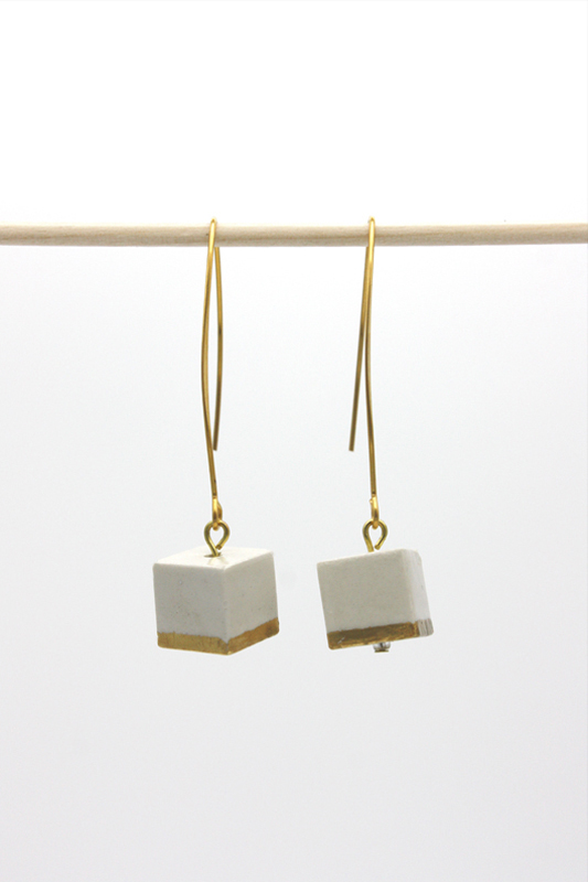 Die lange Variation der Würfelohrhänger, eine Kombination aus Keramik und Metall. Ob in silber oder gold, der glänzende Auftritt ist gewiss.